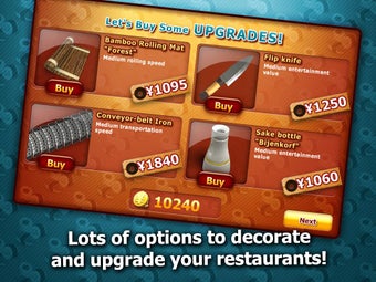 ゲームを進めるうちに寿司のネタが足りなくなってくるので、右端の電話で発注します。在庫切れなどでお客を待たせすぎると、お客は怒って帰ってしまいます。特にご飯が切れてしまうと全てのオーダーがストップしてしまうので、常に在庫は気にしておきましょう。この要素のおかげでゲームが単調にならず、最後まで気を抜かず楽しめます。ゲームのステージには達成目標金額があり、クリアすれば次のゲームに進めるほか、稼いだお金は内装や調理器具などお店のアップグレードに使えます。ゲームは全部で6ステージあり、無料版では最初の1ステージのみをプレイできます。